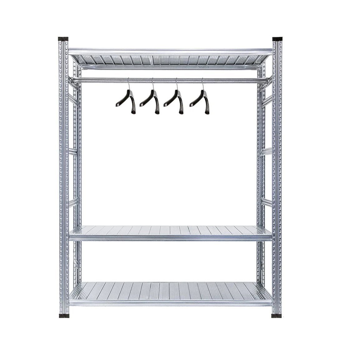 Zestaw składa się z jednego regału głównego o wysokości 1850 mm, głębokości 500 mm, długości 1200 mm (wymiary zewnętrzne z nogami 1280 mm), z 3 półkami i jednym dodatkowym wieszakiem na ubrania.